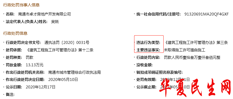 南通市城市管理综合行政执法局行政处罚决定日期为2020年5月10日;国家企业信用信息公示系统网站公示日期为2020年12月17日。