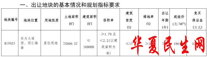 R19025地块位于南通经济技术开发区东方大道西、同仁路南,用地性质为居住用地,土地出让面积约75899.57平方米,规划建筑面积小于等于160000平方米,出让年限70年,容积率1.79-2.2,绿地率大于等于35%,起始价18640元/平方米,其中规划高层住宅不应与低层住宅相邻布置,18层以上(含18层)高层住宅不应与多层住宅相邻布置,低层住宅不得设计成独幢形式。根据R19025地块规划设计条件显示,设置小区公共绿地一处,用地面积不小于4800平方米,并应设置相应的老人和儿童活动场地;建筑风格为现代建筑风格,建筑外立面宜以暖色系为主。