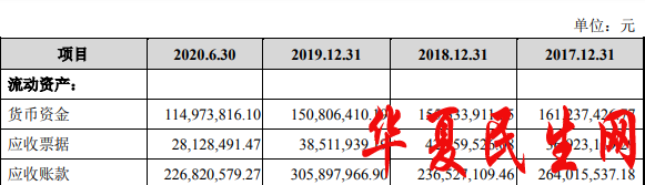 2017年至2020年上半年,公司货币资金分别为1.61亿元、1.55亿元、1.51亿元、1.15亿元;应收票据分别为3692.31万元、4255.95万元、3851.19万元、2812.85万元;应收账款分别为2.64亿元、2.37亿元、3.06亿元、2.27亿元。