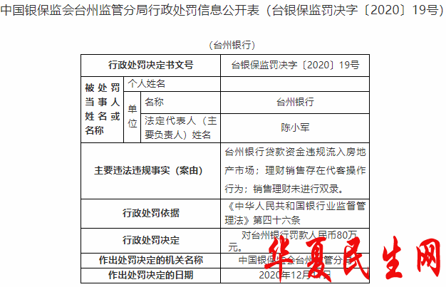 根据《中华人民共和国银行业监督管理法》第四十六条,中国银保监会台州监管分局对台州银行罚款人民币80万元。