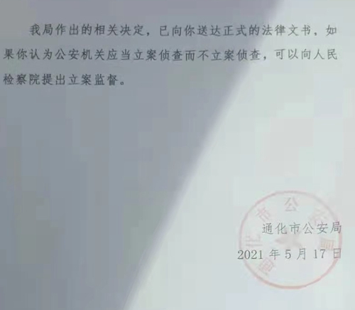 在被逼得走投无路的情况下,2020年4月22日,我才到东昌公安分局报了案……但是两个月后,令人匪夷所思的咄咄怪事发生了:东昌分局经侦大队在根本没有调查取证的前提下,竟以‘未发现犯罪事实’为由下达了不予立案通知书。对此,我不服,将此问题反映到通化市委和市政府,通化市一位主要领导作了批示,要求警方认真调查此案。但是,办案单位、复议、复核单位并没有找我调查,就先后再次做出了没有犯罪事实发生、不予立案的通知(详见东昌公【经侦】不立字【2020】25号)。我认为,通化公安机关的做法,是在保护犯罪,是对犯罪分子的公开袒护和包庇!其对法治环境和经济环境的破坏程度,远远超过武江等人的犯罪,是令人不能容忍的。”