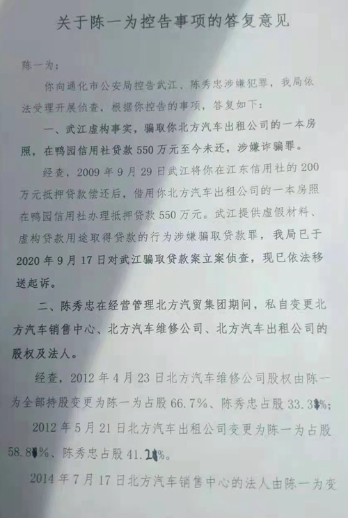 那么,既然武江已经涉嫌犯罪,而且公安机关已经于“2020年9月17日对武江骗取贷款案立案侦查”,为什么至今也不抓人呢?对此,陈一为十分不解。他愤然向通化市委、市政府、市政法委领导再次反映问题。在《关于通化市公安局<关于陈一为控告事项的答复意见>中相关问题的反映》中,陈一为提出几点质疑: