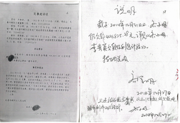 见到记者时,李秀英气愤的说:自己和齐小明总共从齐学明处借款92万元,还款总额为100万元(因为没有对账),从2010年4月3日至2012年7月1日已经还清了全部借款。但是齐小明、齐学明哥俩却主观恶意串通,隐瞒全部还款事实,捏造夫妻债务,企图抢夺我的财产,而本案法官竟然不管青红皂白,也不管他们的证言有多么矛盾、虚假,竟然连他们自相矛盾的说法连论述都没有论述,就直接采信了自相矛盾的证据,明显的是在枉法裁判。有录音证据证明,为了打赢这场官司,他们动用了朋友关系,找了法院的人、公检法的人,还动用了黑社会,果不其然陌生人多次敲门。铁的证据证明,这是一起典型的既遂虚假诉讼案,可是朝阳区法院和长春市中级法院却支持他们的虚假证据。请问,是可忍,孰不可忍?我一定要继续向上反映问题,直到正义得到伸张,虚假诉讼的犯罪分子和他们的保护伞被绳之以法。