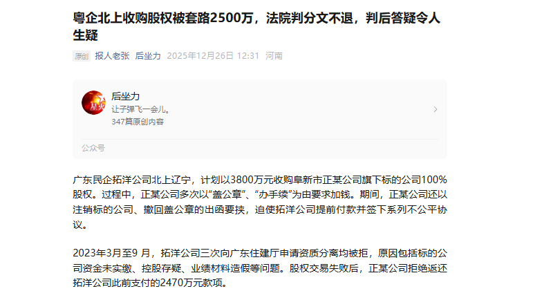 拓洋公司表示,一个总标的3800万元的收购案,在拓洋公司向对方支付2360万元之后,什么都没有拿到,收购目标公司也在诉讼后被正某公司注销,而正某公司仅提供了一些盖有该公司公章的、不符合要求的资料,就通过法院判决拿走了我公司全部的2360万元,更离谱的是,法官对此2360万元的性质认定,连法官自己也说不清,这样的判决,公平、合理以及它的正义性如何体现? 对于该案,拓洋公司已于 2025年8月向辽宁高院提交再审申请,目前该院已受理案件,正在审查当中。 对于该案的进一步发展,我们将持续关注。