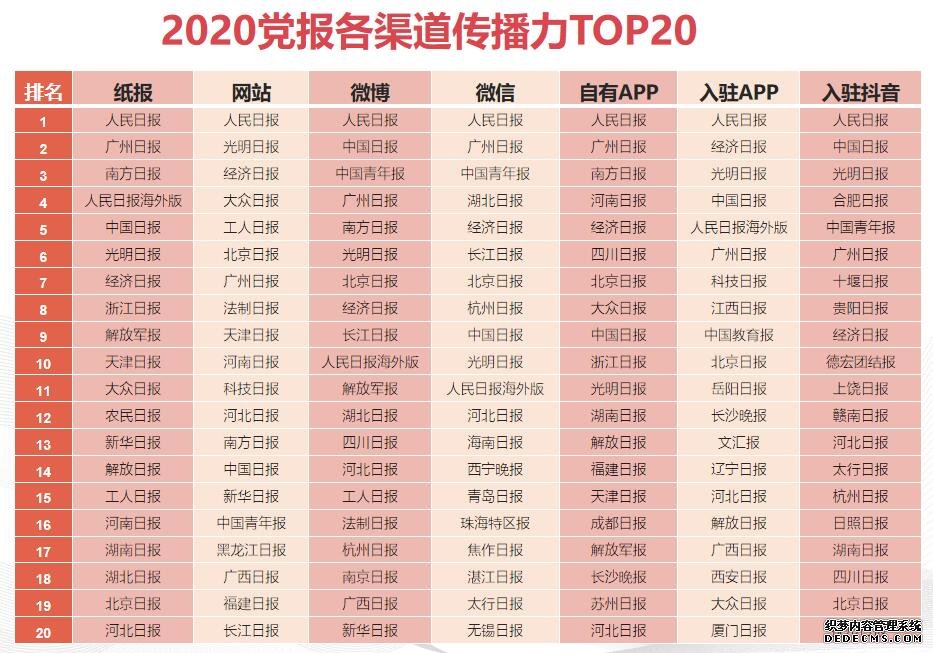 根据党报在纸报、网站、微博、微信、自有客户端、入驻客户端及短视频平台的内容生产及传播情况进行综合评估,党报融合传播力综合排名前十及各渠道传播力排名前二十的名单请看图。