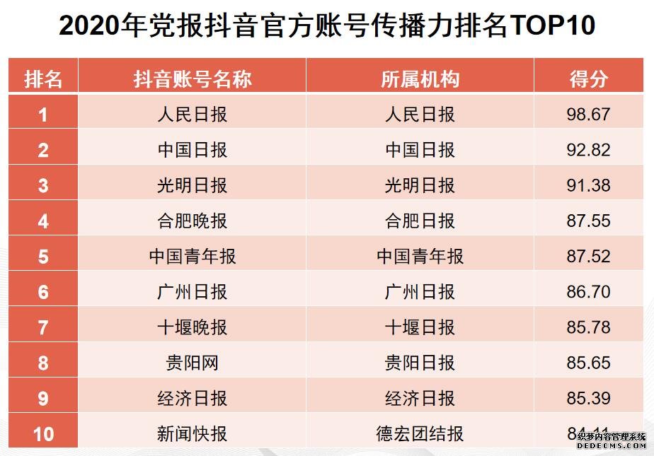 传播力排名前10的党报抖音号中,5个为中央级党报抖音号,5个是地市级党报抖音号,涌现出一批党报短视频新秀。