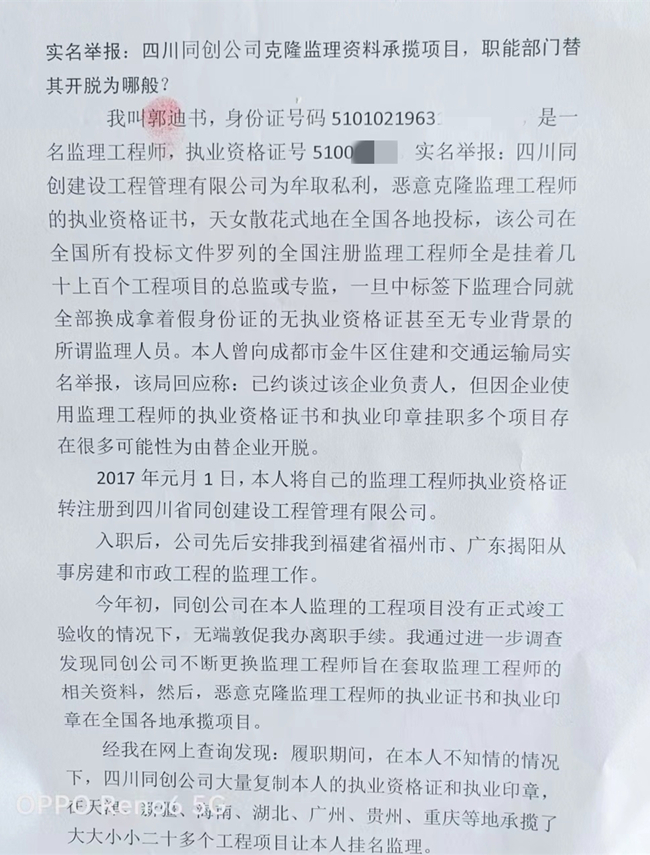 我叫郭迪书,身份证号码5101021963********,是一名监理工程师,执业资格证号5100****。实名举报:四川同创建设工程管理有限公司为牟取私利,恶意克隆监理工程师的执业资格证书,天女散花式地在全国各地投标,该公司在全国所有投标文件罗列的全国注册监理工程师全是挂着几十上百个工程项目的总监或专监,一旦中标签下监理合同就全部换成拿着假身份证的无执业资格证甚至无专业背景的所谓监理人员。本人曾向成都市金牛区住建和交通运输局实名举报,该局回应称:已约谈过该企业负责人,但因企业使用监理工程师的执业资格证书和执业印章挂职多个项目存在很多可能性为由替企业开脱。