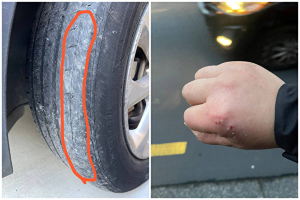 左图为邢鉴的车胎疑似有被刀划的一道痕迹。右图为6月14日,邢鉴在中共总理李强下榻Cordis酒店外参加抗议活动时遭围殴自卫,手背擦伤。(受访者提供)