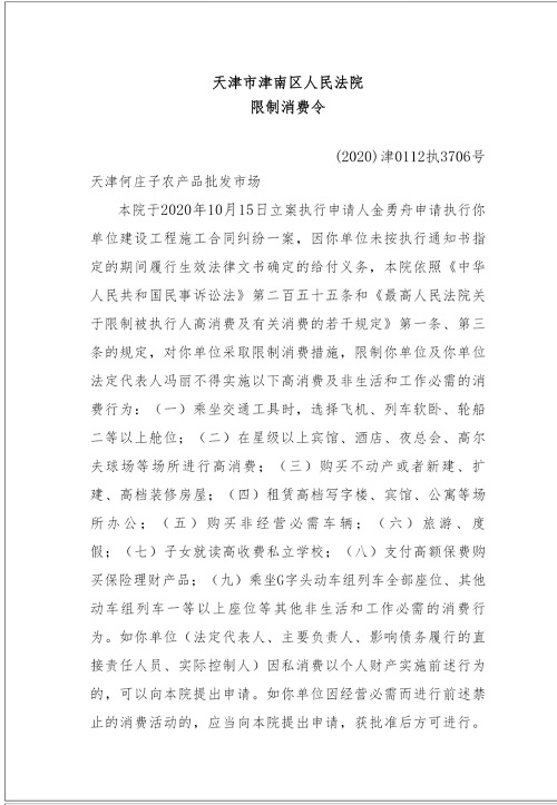 值得注意的是,11月2日津南区人民法院向何庄子农产品批发市场、冯某下达《限制消费令》,上述二公司/人成为“老赖”。检索判决书后获悉,被列为“老赖”是由于拖欠上述“违建危楼”的工程款。