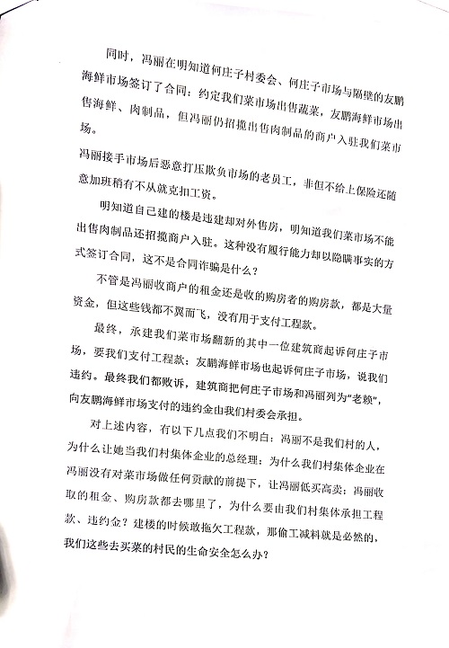 并“强烈要求:(1)上级领导督促何庄子村委会和何庄子市场公布和冯丽签的合同、各项财务报表、银行流水;保障我们村民的合法权益,履行之前的承诺,退还拖欠我们的保险金;(2)不能让菜市场的商户搬到新建的“活人的墓地”里,把商户清出来”。