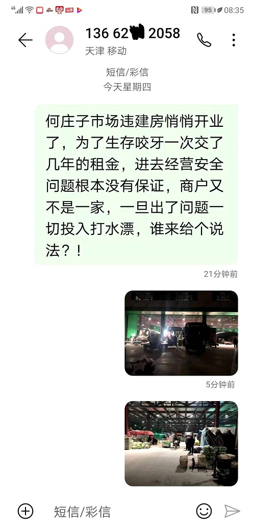 然而,近日有知情人反映,何庄子菜市场已于12月3日安排商户入驻上述“违建危楼”,并正式营业,知情人已向津南区、双港镇两级党政机关高层领导反映。