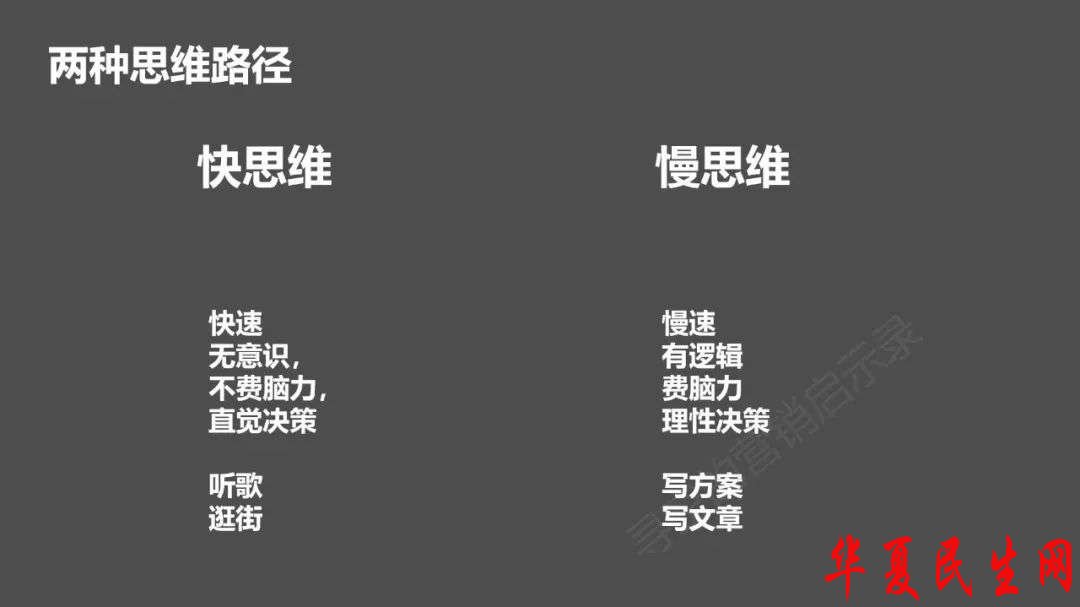 首先回顾一下快思维及其作用。丹尼尔·卡尼曼进而在《思考,快与慢》一书中,将人的思维分为两个系统: