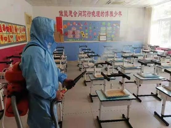 工作人员在北京市海淀区第四实验小学喷洒阳谷生物公司生产的次氯酸液进行环境杀毒
