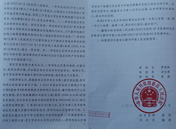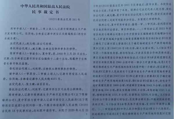 日前,最高人民法院做出(2020)最高法民再261号民事裁定书,裁定原审判决事实不清,撤销原判,发回重审,从而终结了吉林省高级人民法院和辽源市中级人民法院一错误判决。至此,辽源市西安区人民政府(以下简称西安区政府)与辽源市绿洲速生丰产林开发有限公司(以下简称绿洲公司)一场持续三年多的土地官司终于出现了新的拐点。