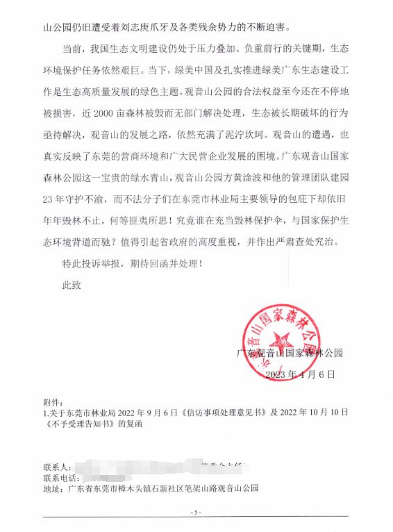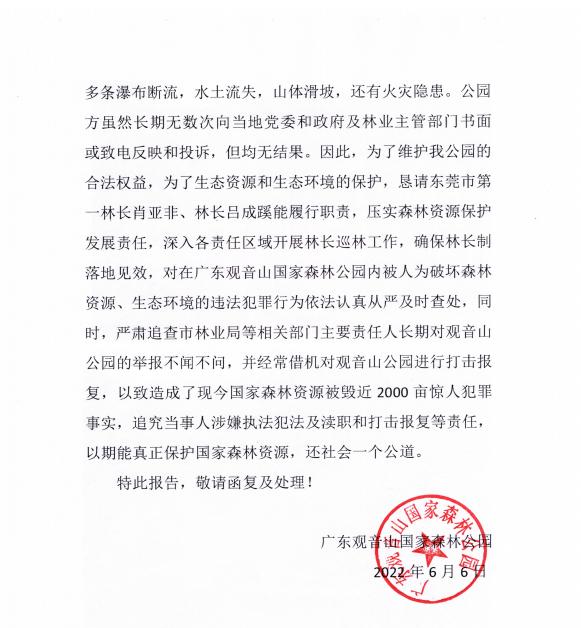 “按照国家相关森林法律规定,东莞市自然资源局、东莞市林业局负有对毁林违法行为进行依法查处的法定职责。”观音山景区的一位老员工表示,每次我们景区发现乱砍滥伐、违建现象后,都及时向东莞市自然资源局、东莞市林业局、樟木头林业站、樟木头农林水务局等进行反映,相关主管部门过来也只是走走过场,再无后续。比如,在2019年观音山景区以书面形式向东莞市自然资源局、东莞市林业局及有关部门反映情况,但都没有得到正面回应和处理。