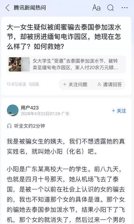 4月23日,“女生受邀去泰国泼水节被转卖电诈园”的话题冲上热搜,引发广泛关注。当天,当事女生的父亲告诉极目新闻记者,新闻报道发出后,对方感受到了压力,想让删除相关新闻报道,“那个人(园区老板)很嚣张,说那里是一个无秩序的地方,警方也拿他们没办法,一直给我们讲放人,但一再出尔反尔。”