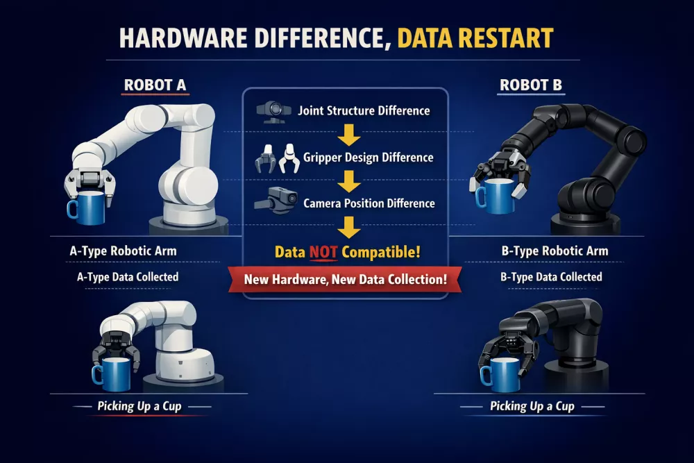 型机械臂。机械臂的关节结构不同、末端夹爪的形状不同、摄像头的位置不同,同样的”拿起杯子”这个动作,在两种机器人身上对应的运动轨迹可以完全不一样。换一款硬件,数据就得重新采,等于每次升级硬件,都要回到原点重新开始。