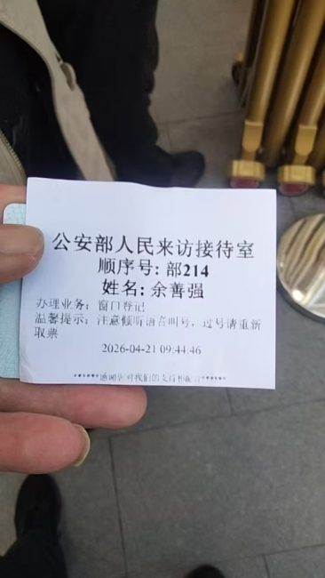 余善强称,4月21日其在河南郑州向最高人民法院第四巡回法庭反映情况后,在板桥店镇政府干部范义盟等人协调下进京。其随后前往最高人民检察院、公安部递交材料,请求对其子案件立案复查。