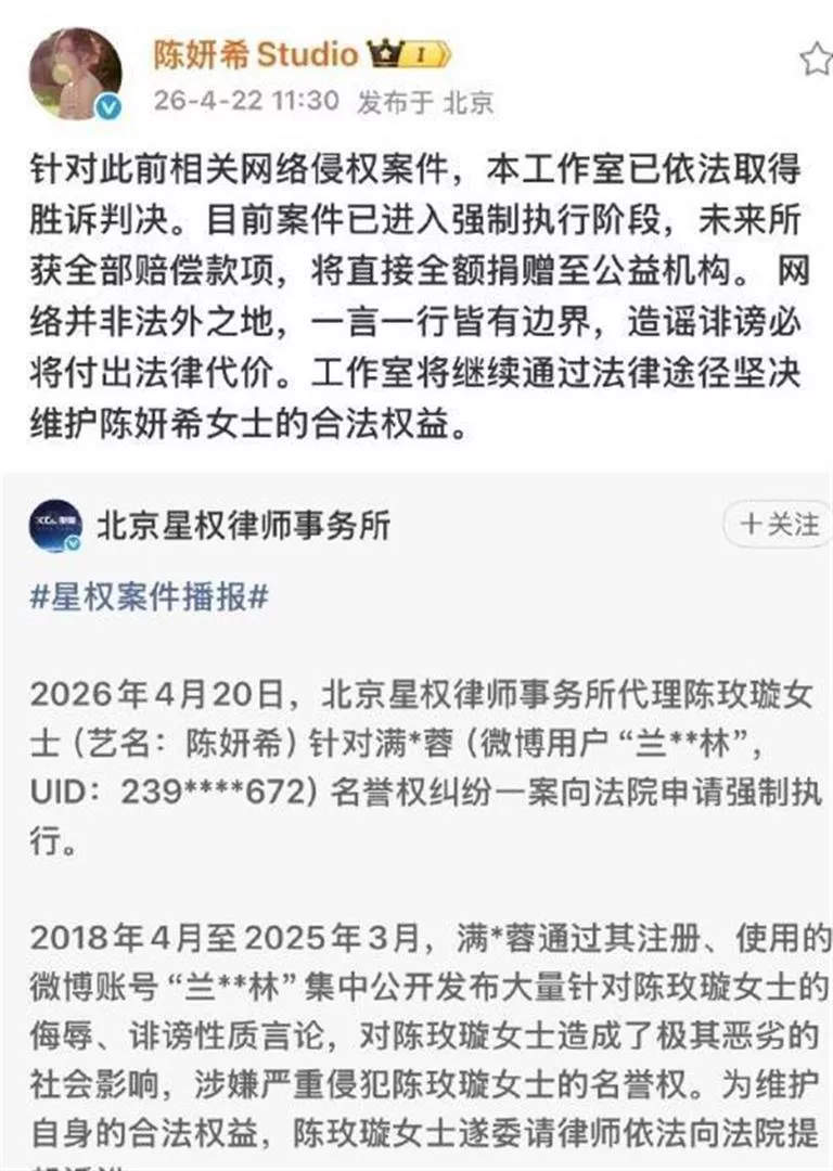 两天后,4月22日,律师事务所公开了案件播报,陈妍希工作室也发文确认案件进入强制执行阶段。