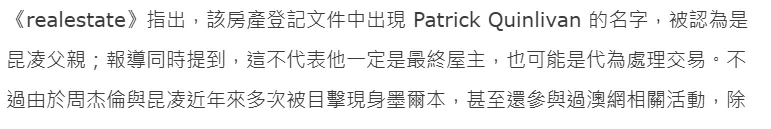 值得一提的是,房产文件登记名字出现Patrick Quinlivan,是昆凌父亲的名字,疑似是以岳父的名义买下。
