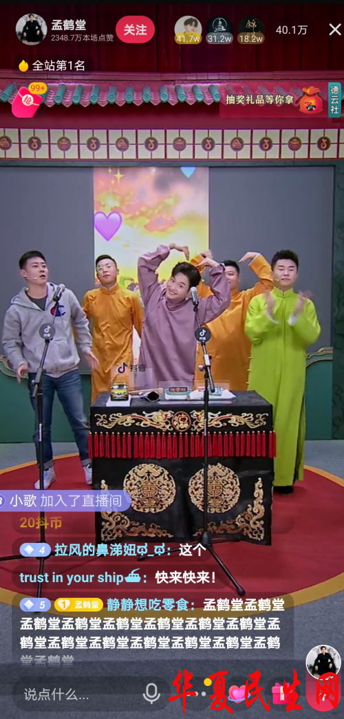 12月23日晚7点,德云社鹤字科演员孟鹤堂抖音直播专场如期而至,十年搭档周九良及龙字科招生特别指导栾云平等多位相声演员现场助阵,在德云社龙字科招生即将开始之际,为观众带来传统曲艺、流行舞蹈和描眉画像等多种才艺技能展示。