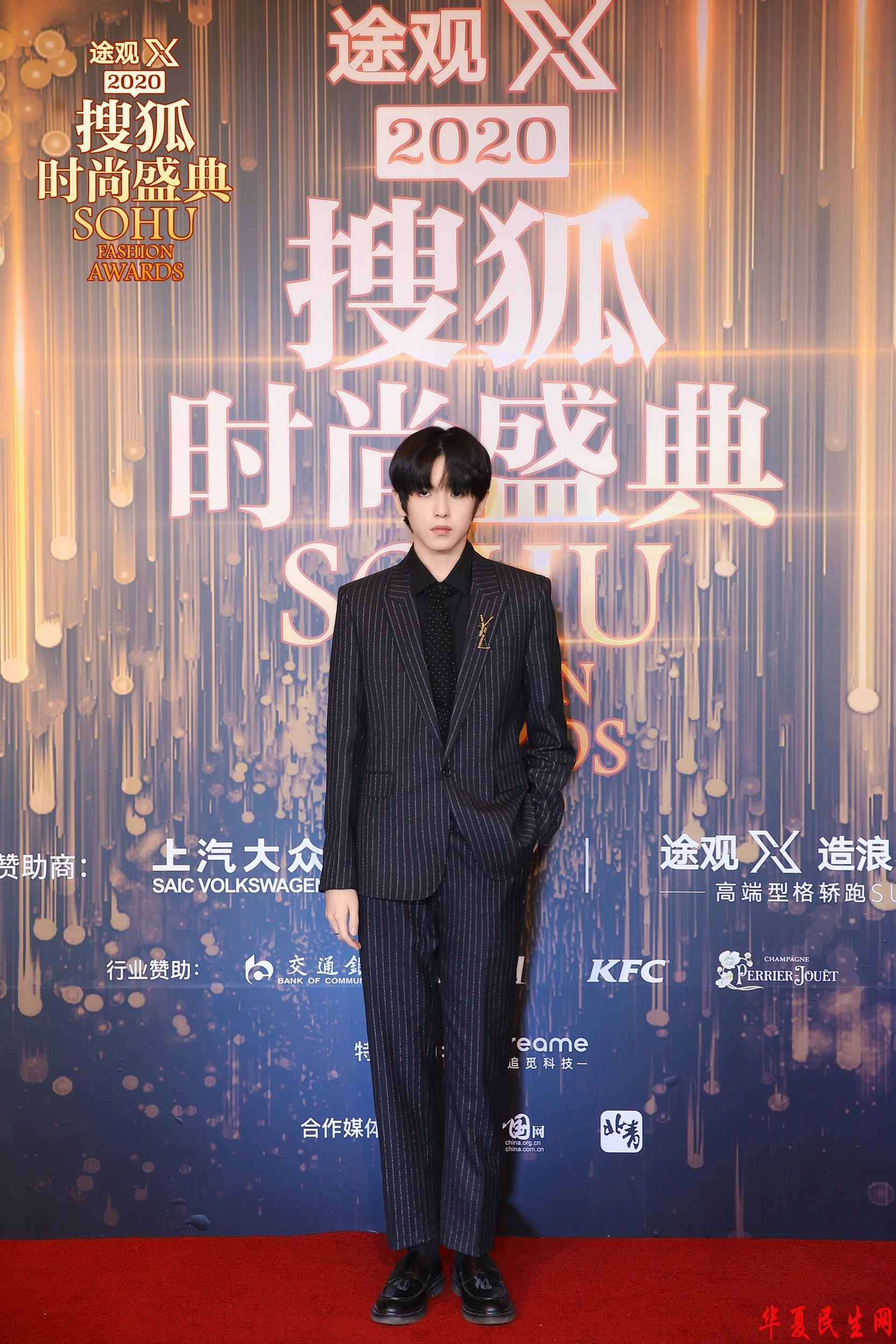 胡春杨现身红毯,身穿黑色条纹西装,其中点缀着星星点点的亮片,连领带也不放过,今晚是闪闪发光的小王子本人。