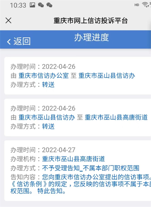 经信访查询得知:重庆市信访办公室至重庆市巫山县信访办再至重庆市巫山县高唐街道。重庆市巫山县高唐街道出具不予受理告知-不属本部门职权范围。内容为:您向重庆市信访办公室提出的信访事项。根据《信访条例》的规定,您反映的信访事项不属于本部门职权范围,特此告知。