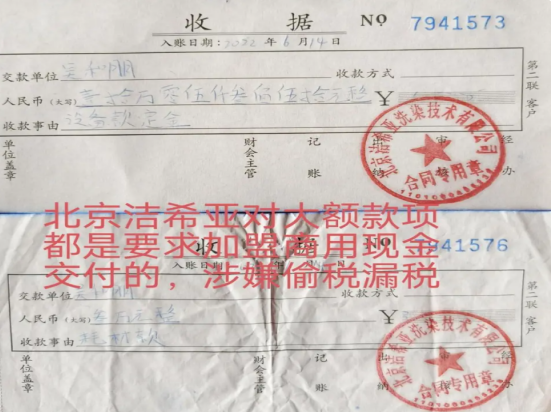 在北京国际洗衣总部(常州培训基地)培训半个月后,工作人员又让我把剩下的尾款以及耗材费、管理费、品牌费等所有的费用全部交清才能回家。至此,我在培训期间总计交了多达22万元,已经远远超出了我的预算,这还没有包括房租和店面装修费用。因此不打算继续开加盟店了,于是找到北京洁希亚国际洗衣常州培训基地的负责人,要求退钱,或者少退一点也行。但是该负责人说不行,称钱已经打到公司账户上了,无法退还。并且我们在培训基地交钱的时候,大额的款项都是要求我们交现金,北京洁希亚国际洗衣还涉嫌偷税漏税,请求有关部门对此进行调查。