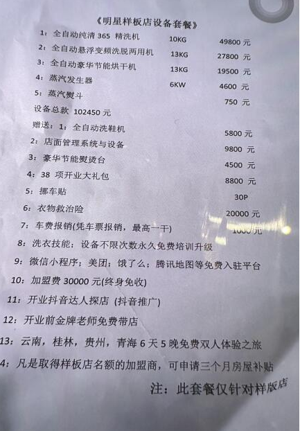 洁希亚公司365的干洗机换成360的干洗机要加50,000块钱,一台干洗机卖98,000元;配的一台老式的洗鞋机做生意完全洗不了鞋子,那就又要换洗鞋机,说又要加5000块钱;配的原有的烫台平板烫台说现在开店不实用,又给我们介绍鼓风烫台,又要加几千;总之就是在引导性的让我们换套餐,变着花样让我们花钱!