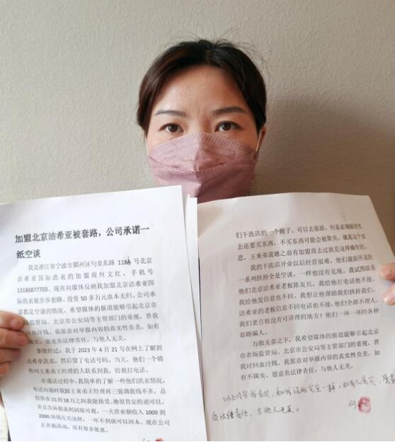 我是浙江省宁波市鄞州区句章东路1186号北京洁希亚国际洗衣的加盟商何文红,手机号13186877703。现在向媒体反映我加盟北京洁希亚国际洗衣被步步套路、投资50多万元血本无归、公司承诺都是空谈的情况。希望媒体的报道能够引起北京市市场监管局、北京市公安局等主管部门的重视,替我讨回血汗钱。我愿意对举报内容的真实性负责,如有不属实,愿意负法律责任,与他人无关。