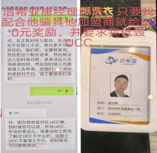 更可恨的是,即便我的生意惨淡,投资款血本无归。区域经理唐子韩还让我帮助他忽悠其他的加盟商,并承诺成功一个给800元的奖励;即便不成功,也给100元的奖励。要求我按照洁希亚工作人员的话术配合他们说洁希亚怎么怎么好,并且还要我诋毁洗衣行业的UCC品牌,让我说UCC品牌不靠谱。