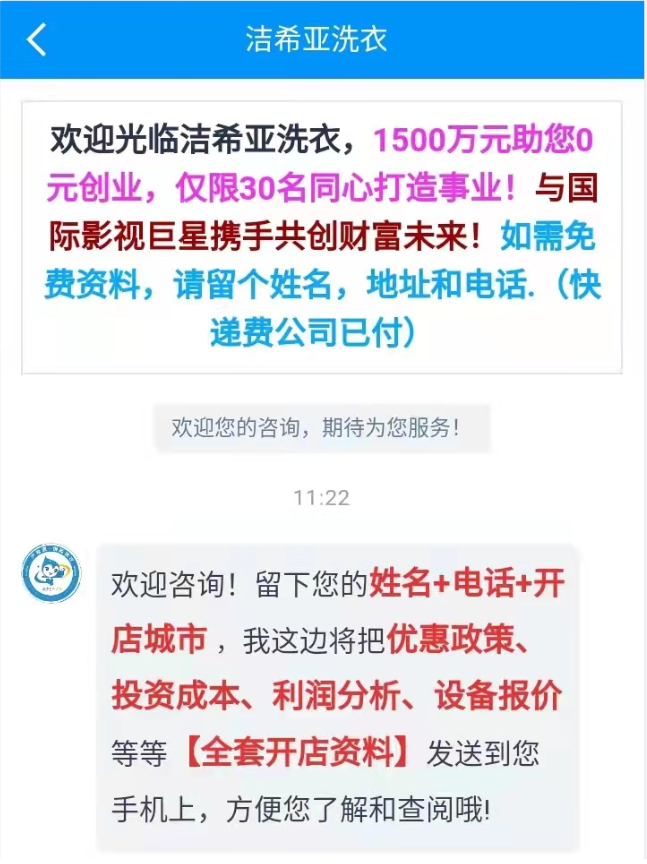 我的干洗店开业以后经营很难,他们前面所说的一系列扶持全是空谈,一样也没有兑现。我试图联系北京洁希亚老板陈友兵,我给他打电话他不接,我给他发信息也不回。我想让他帮助我们扶持我们,洁希亚的老板信息不回电话也不接,他们全部不理人,我们老百姓没有可讲理的地方!他们一环一环的各种套路骗人。