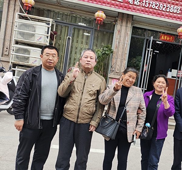 4月11日,维权律师江天勇(左一)等人接邢望力(左二)出狱。(受访者提供)