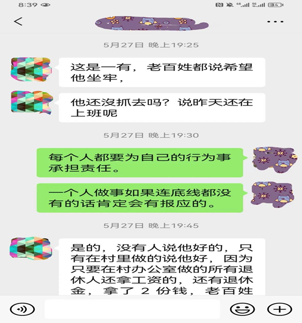然而,自开完会,村民的不安全感愈发明显,纷纷有群众私下讨论“他还没抓去吗?说昨天还在上班”。“是的,没有人说他好的,只有在村里做的说他好,因为只要在村办公室做的所有退休人还拿工资的,还有退休金,拿了双份钱,老百姓多在说只有陈家角村这样的,曾经有人举报,也查过账后来就不了了之,真的了不得啊,无法无天”等等。由于周某纳根深蒂固,村民更多的是敢怒不敢言。