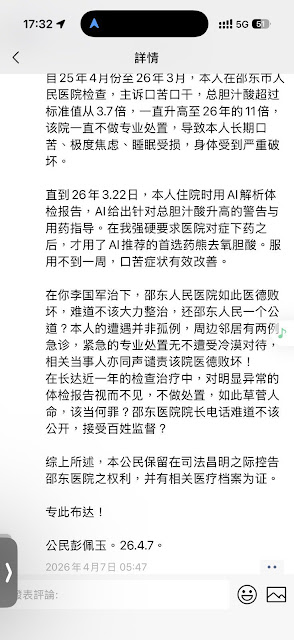(维权网信息中心报道)2026年4月23日,本网获悉:湖南异议人士彭佩玉先生,因口苦口干,25年4月去湖南邵东人民医院进行检查治疗,至26年3月将近一年的治疗,从胆汁酸超过标准值3.7倍,升高到标准值的11倍,病情不仅没有好转而是加重了,导致极度焦虑,睡眠质量严重下降,健康严重受损,彭佩玉先生无奈之下,利用AI搜索出来的治疗推荐用药熊脱氧胆酸,服用不到一周,口苦症状明显改善。